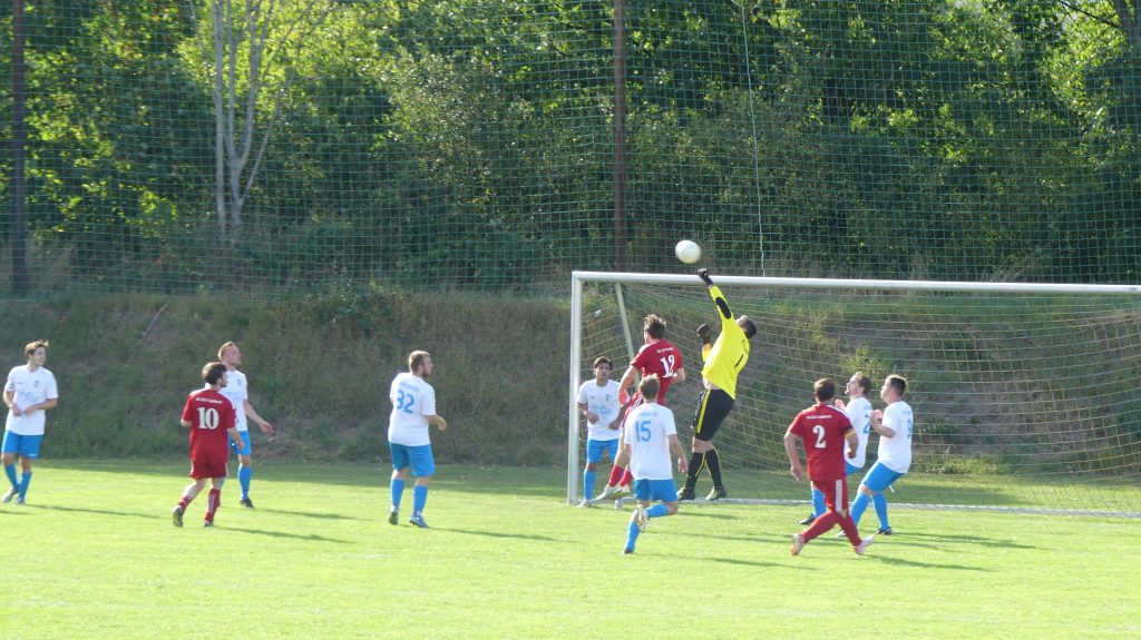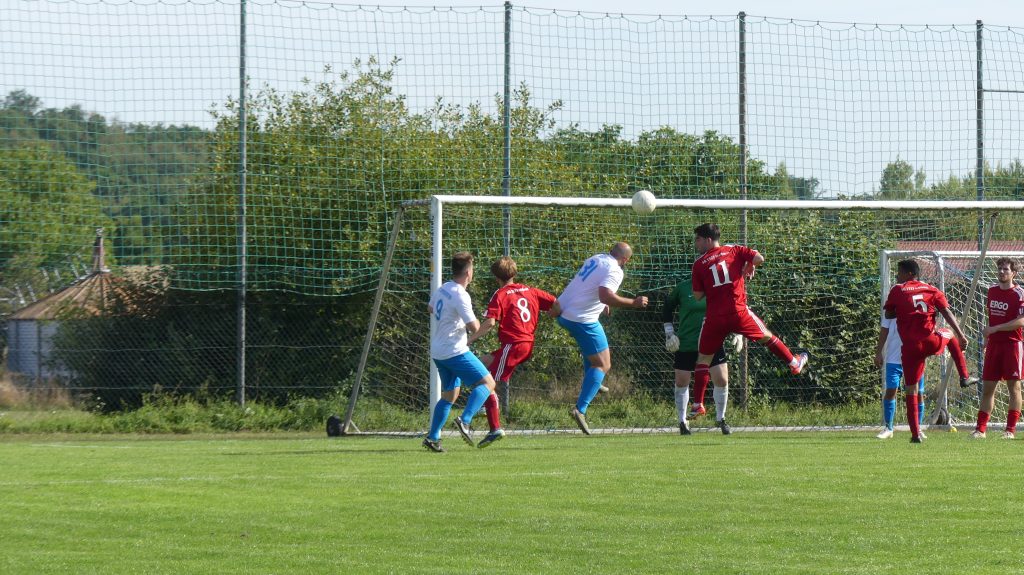 Die SGO suchte weiter den Weg nach vorne. Bei einem kurz ausgeführten Abstoß der Gäste eroberte Daniel Warner mit energischem Einsatz die Kugel, marschierte bis zur Strafraumgrenze und suchte den Abschluss. Beim Gästeschlussmann war jedoch Endstation. Wenige Augenblicke später machten die Besucher in der Offensive auf sich aufmerksam. Marcel Hebich im SGO-Kasten behielt bei einem strammen Torabschluss nach einem Konter aber die Oberhand. Kurz danach hatte die Nr. 1 der Blau-Weißen allerdings das Nachsehen. Nach einem Rückpass wurde er von einem gegnerischen Stürmer unter Druck gesetzt und beim Versuch, den Ball wegzuschlagen, geblockt. Auch im Nachsetzen war der Angreifer der Spielgemeinschaft vorm Oppershofener Torwächter am Leder, sodass er nur noch einzuschieben brauchte. Drei Minuten waren zu diesem Zeitpunkt im ersten Abschnitt noch auf der Uhr.